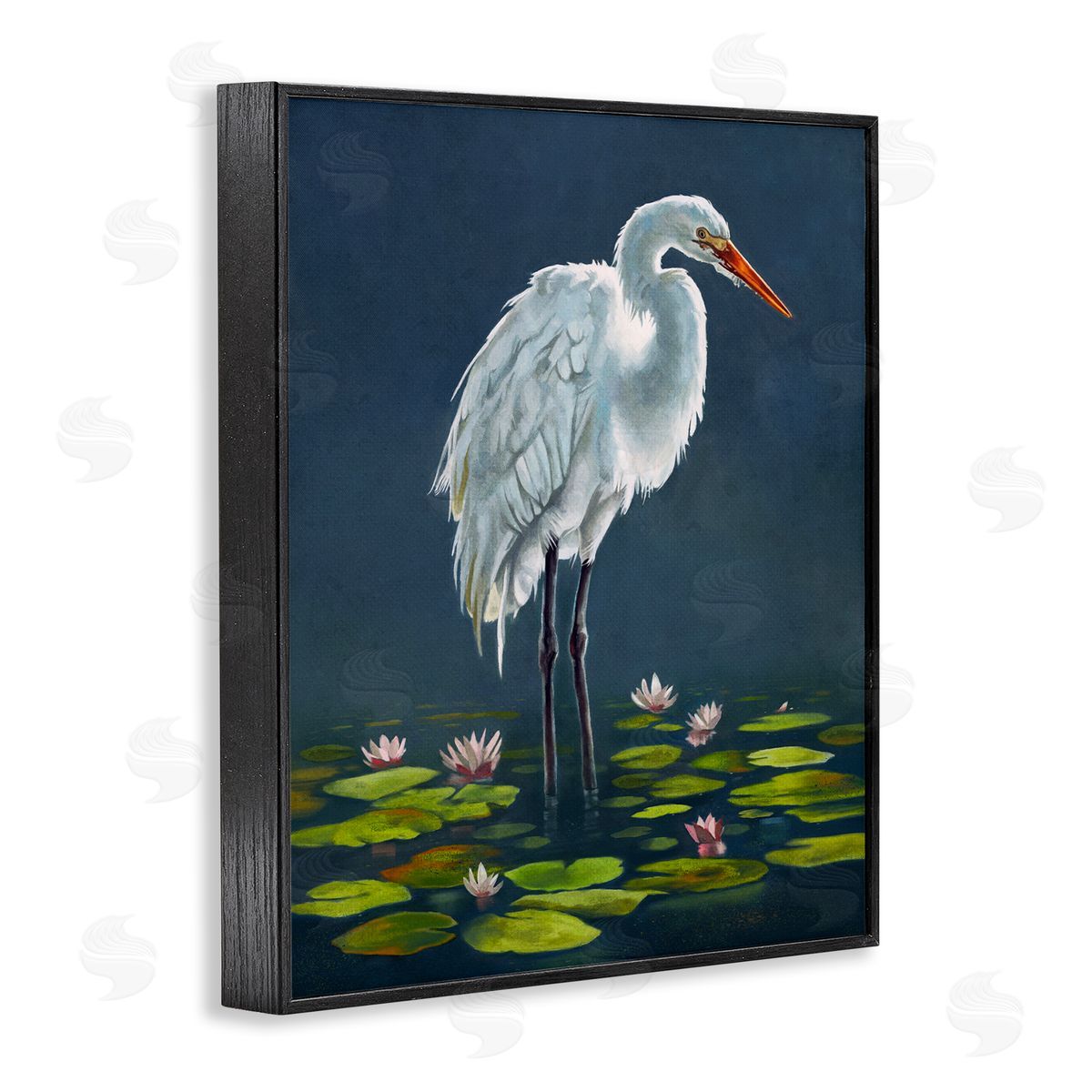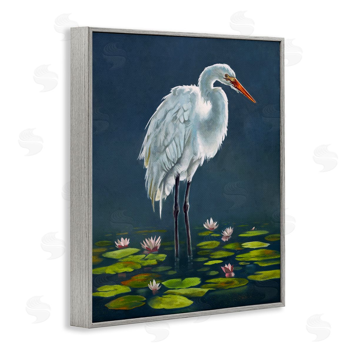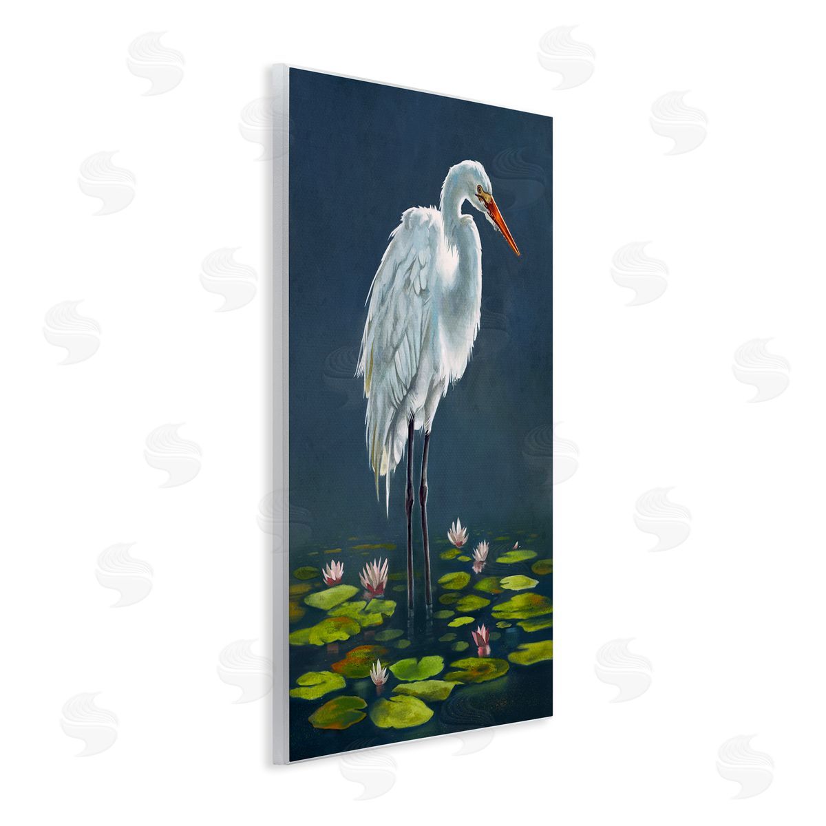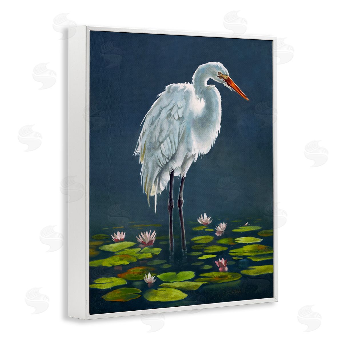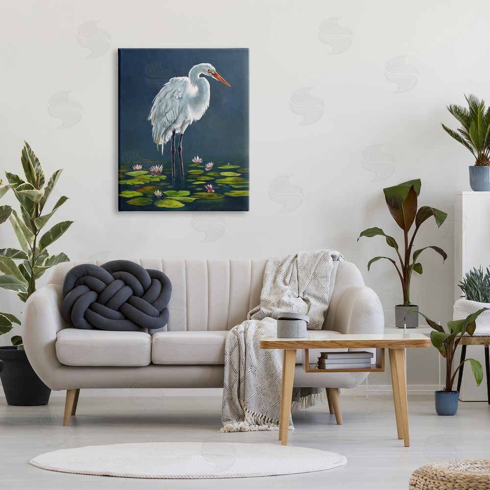 Lucca Sheppard | Egret Bird Standing Lily Pad Pond Deep Blue