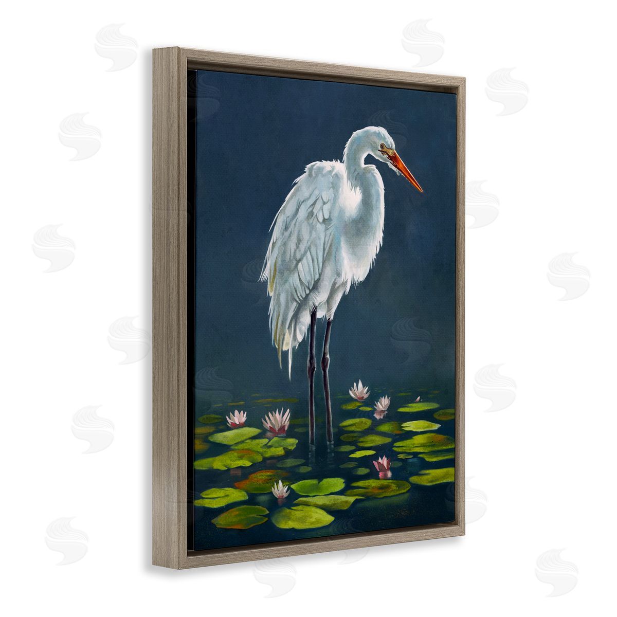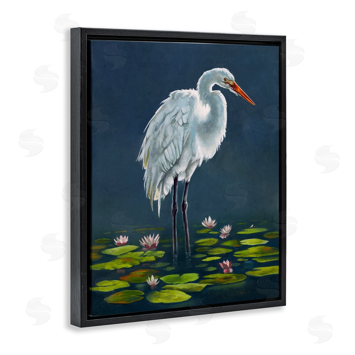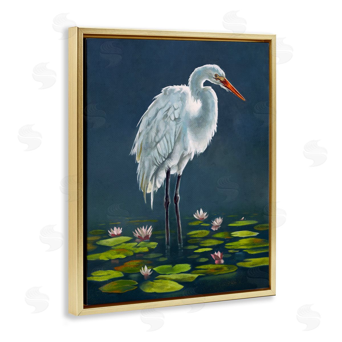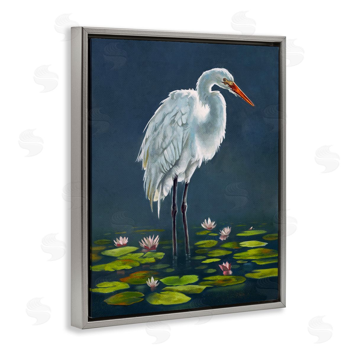 Lucca Sheppard | Egret Bird Standing Lily Pad Pond Deep Blue