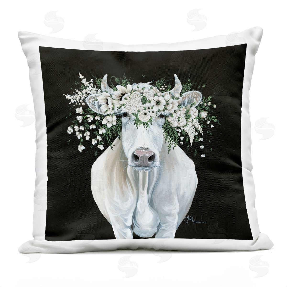 Hollihocks Art | White Cow with Flower Garland Printed Throw Pillow