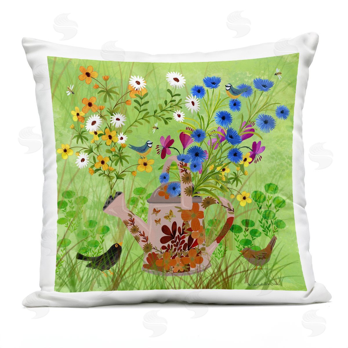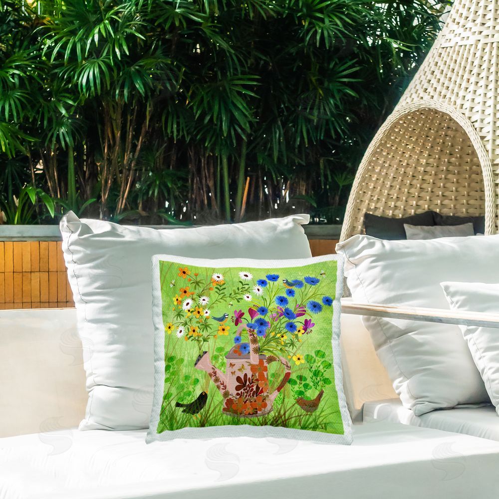 Kay Widdowson | Bright Gardening Can & Birds Printed Throw Pillow
